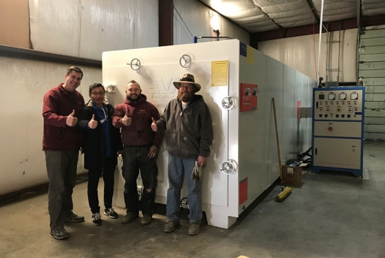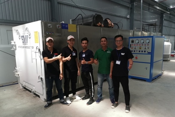 Recently, SW-12.0 model high frequency vacuum drying kiln has been installed in the United States by experts Leo and technician Jack. This advanced kiln, developed by